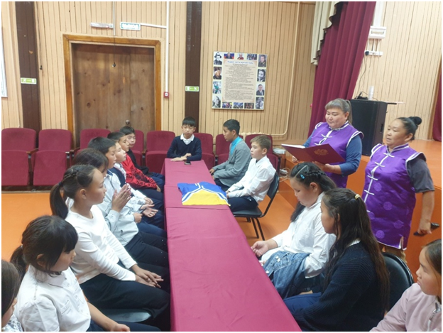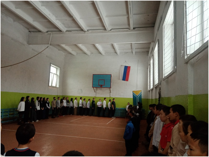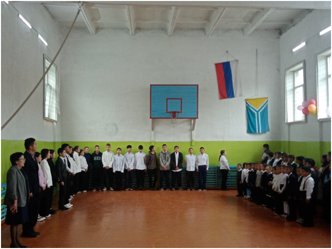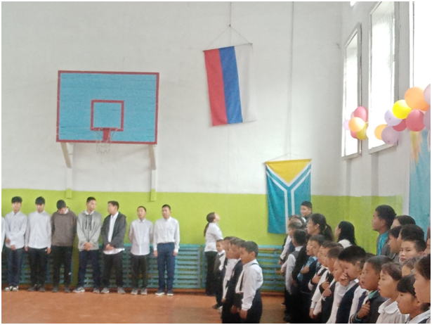 Торжественная линейка началась с поднятия государственных флагов Российской Федерации и Республики Тыва. Право поднять государственные флаги было предоставлено ученикам 5 класса Косоевой Оргаадай, Киликеевой Дарине, Сандый Ананде.