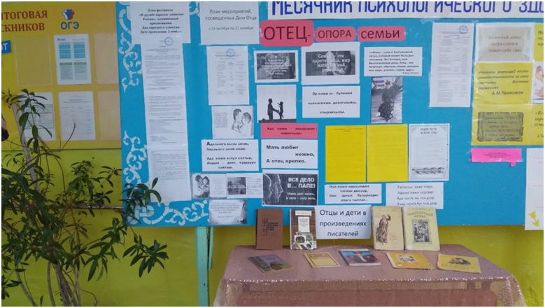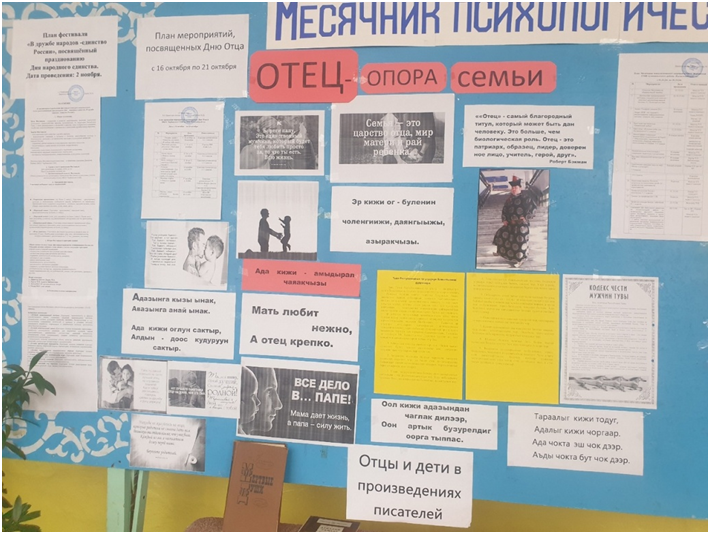 В преддверии Дня отца библиотекарь Хертек Ч.Ч. в фойе школы оформила информационный стенд «Отец опора семьи», около которого проходят тематические беседы и обзоры представленного материала.