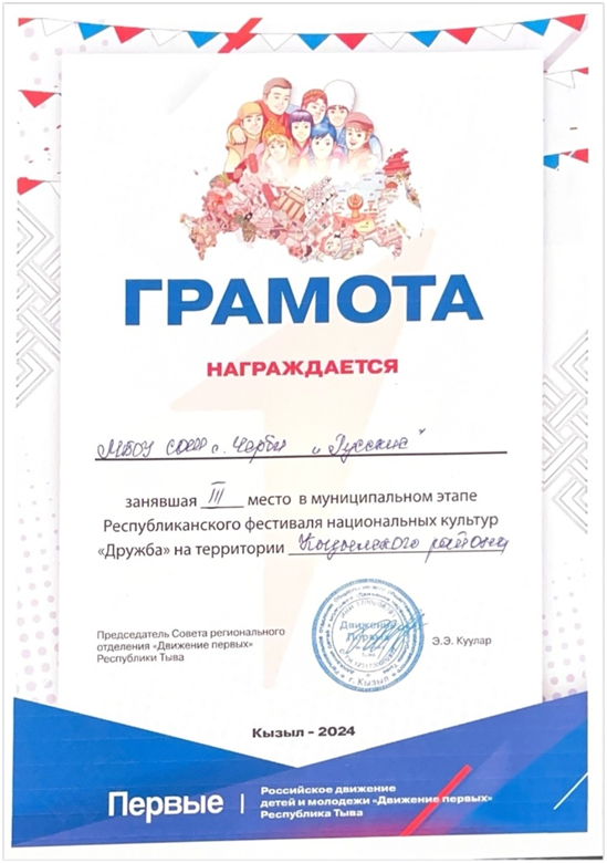 Сегодня учащиеся старших классов под руководством Советника директора по воспитанию Хертек С.И. приняли участие в муниципальном этапе фестиваля «Дружба», который проводится в рамках реализации федерального проекта «Патриотическое воспитание граждан Российской Федерации» национального проекта «Образование» и в соответствии с утвержденным планом работы регионального отделения Общероссийского общественно-государственного движения детей и молодежи 2Движение первых» Республики Тыва. Целью данного фестиваля является сохранение и развитие национальных традиций, укрепление культурного взаимодействия народов, проживающих на территории Республики Тыва, популяризация идей единства и дружбы народов. Школьники приняли активное участие, представили музыкальную композицию. Жюри высоко оценило творчество детей и присудило 3 место в данном мероприятии. Поздравляем руководителя Хертек С.И., танцевального руководителя Соян А.А. и других педагогов, принявших участие в подготовке школьников!