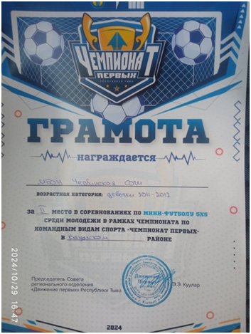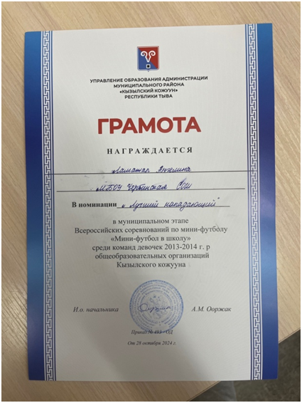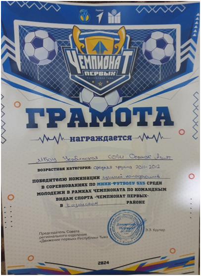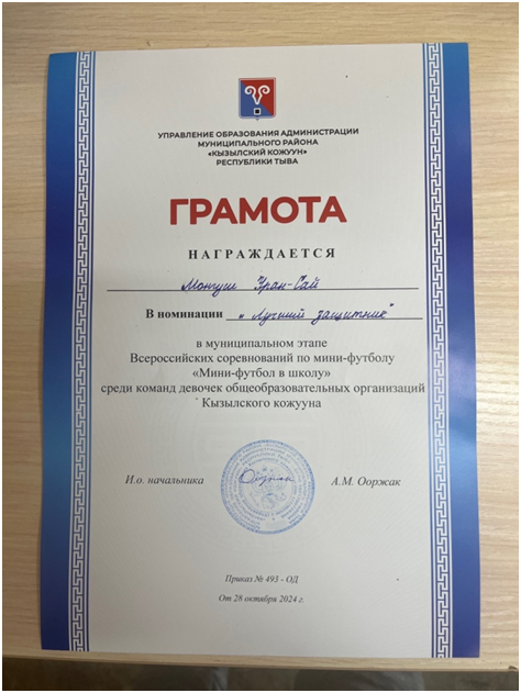 В соревнованиях по муниципальному этапу мини-футбола среди девочек отличились ученицы 6 класса Ламажап Ангелина (Лучший нападающий), Монгуш Чочагай (Лучший вратарь) и уеница 4 класса Монгуш Уран-Сай (Лучший защитник). Команда девочек заняла 1 место и будет защищать честь нашего кожууна в республике. Поздравляем школьную команду и желаем ей дальнейших учпехов!