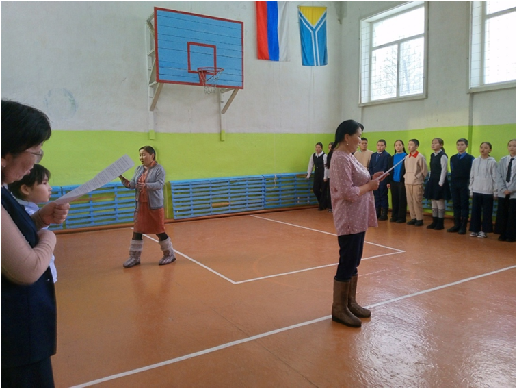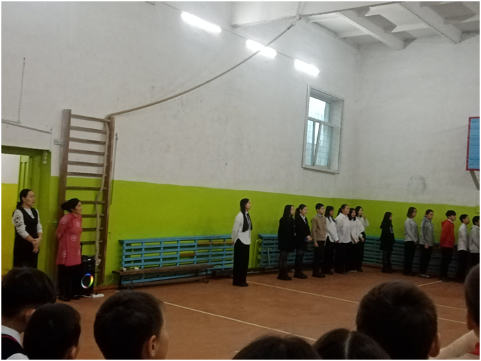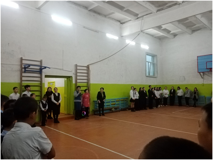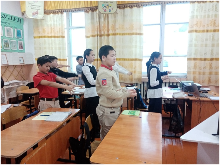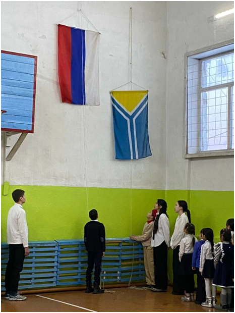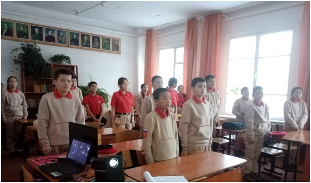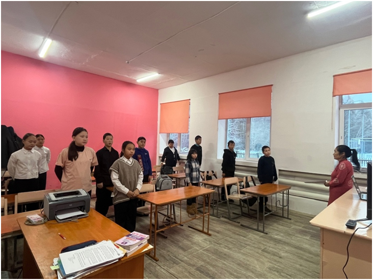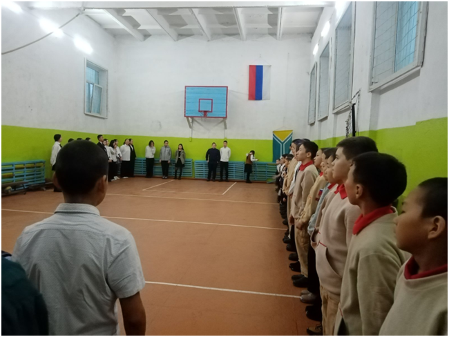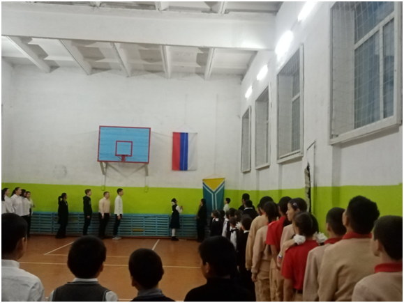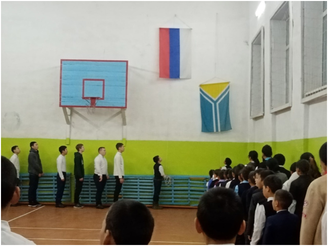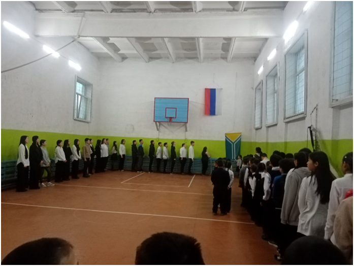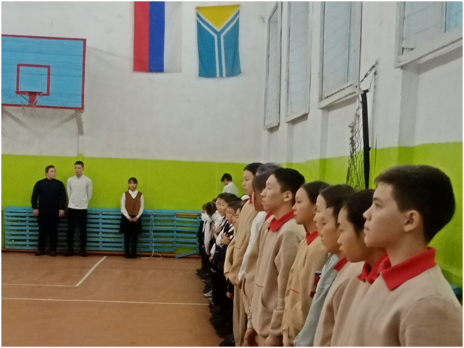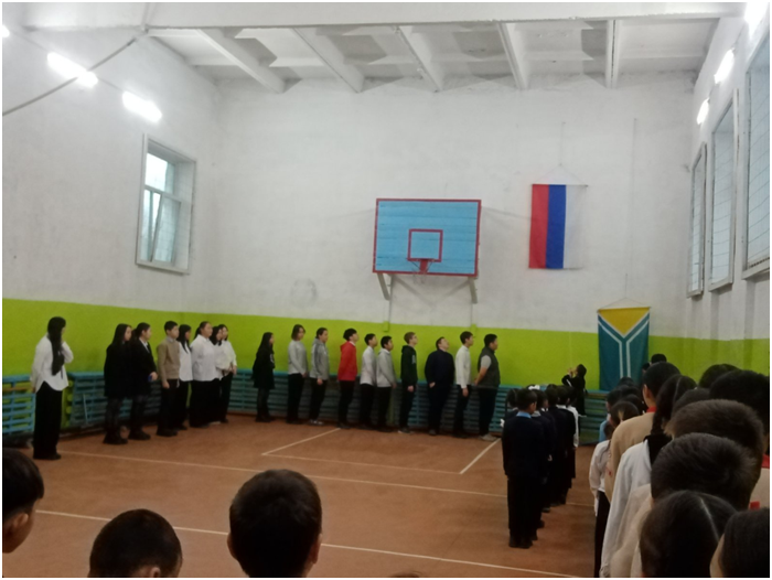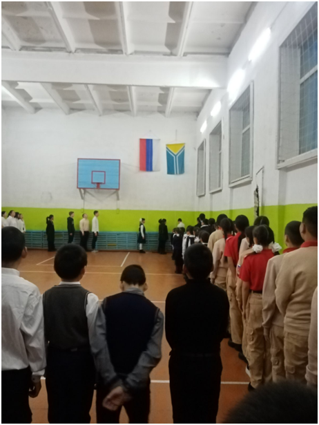Учебный день новой недели начался с контроля по соблюдению мер безопасности по профилактике ОРВИ, гриппа и других инфекционных заболеваний. В 8.00 часов была организована церемония поднятия государственных флагов Российской Федерации и Республики Тыва. Право поднять государственные флаги было предоставлено участникам ежемесячного кожуунного турнира по национальной борьбе «Хуреш» среди школьников.