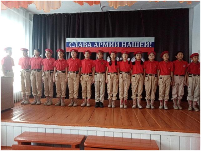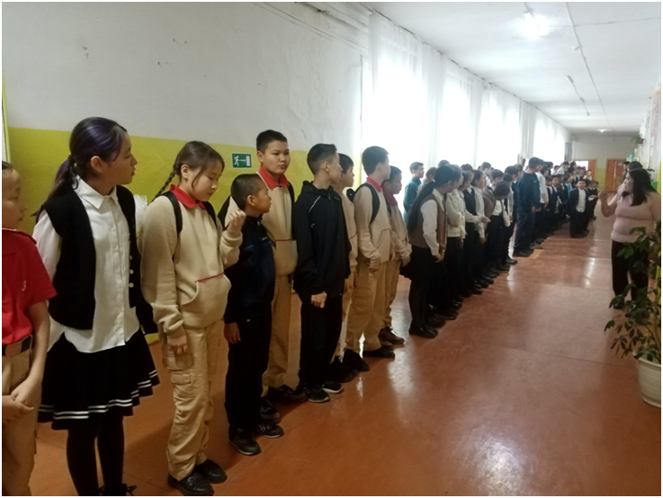 После церемонии поднятия государственных флагов проведена общешкольная линейка. Анализ работы за прошедшую неделю и план школьных мероприятий на следующую озвучены директором школы Доржу М.А., заместителем директора по НМР Ооржак Ш.Д. Дежурный класс по школе 9 «а» класс (классный руководитель Соян А.А.).