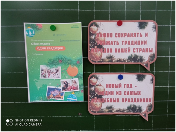 Затем классными руководителями во всех классах проведены внеурочные занятия из цикла «Разговоры о важном» на тему «Одна страна –одни традиции» с целью расширения представлений обучающихся о традициях встречи Нового года в России, формирования осознания младшими школьниками ценности семейных новогодних традиций, воспитания уважительного отношения к семье, родным и близким, укрепления позитивного отношения к совместной деятельности.