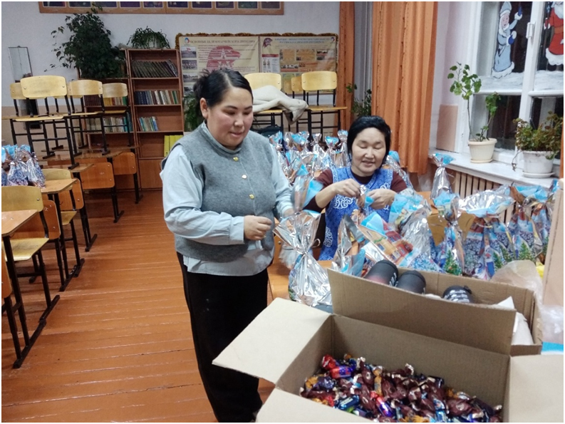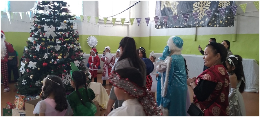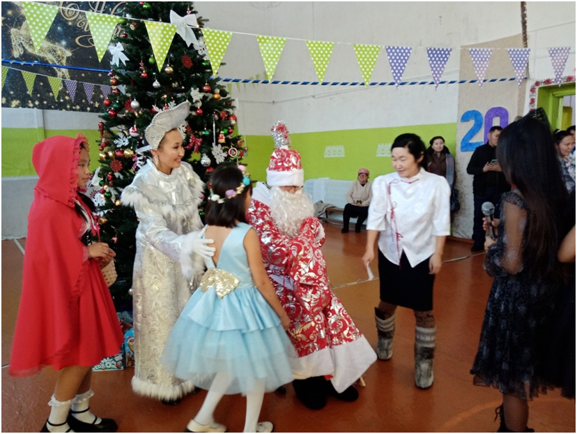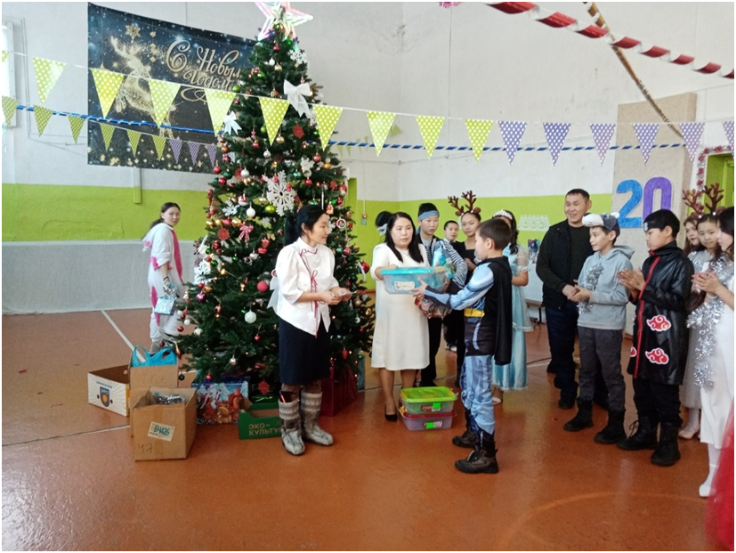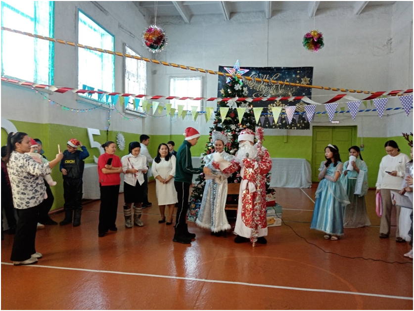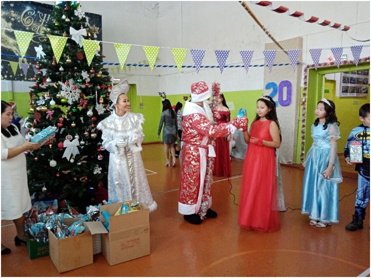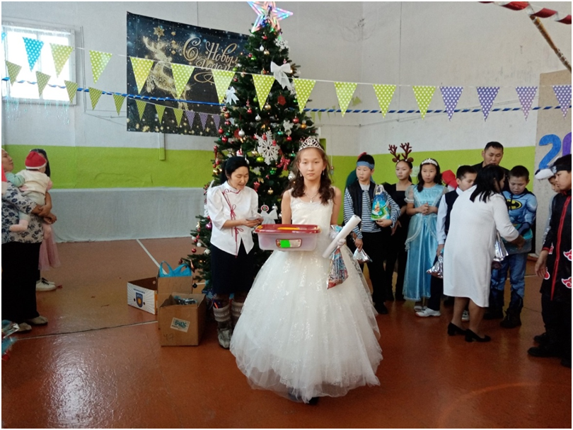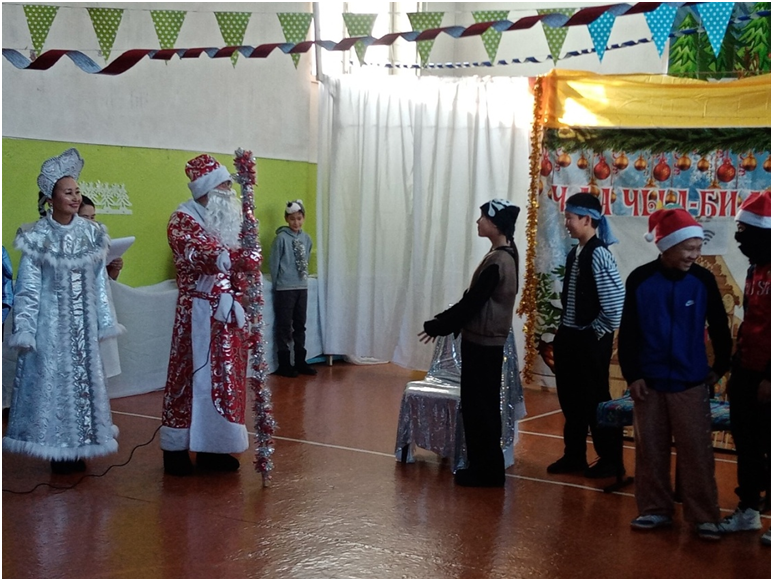 Новый год для детей – это пора сказок и чудес. В это время дети ждут прихода Деда Мороза, Снегурочки и, конечно же, подарков. Школьники вместе со своими классными руководителями проявили фантазию при оформлении учебных кабинетов. Молодые педагоги во главе с директором школы Доржу М.А. красочно и празднично украсили спортивный зал, где проходили новогодние утренники. В ходе мероприятий школьники водили хороводы, участвовали игровых конкурсах, рассказывали Деду Морозу стихи, пели песни, танцевали. Также администрация школы наградила отличников, ударников, активистов общественной жизни. От Деда Мороза и Снегурочки дети получили сладкие подарки.