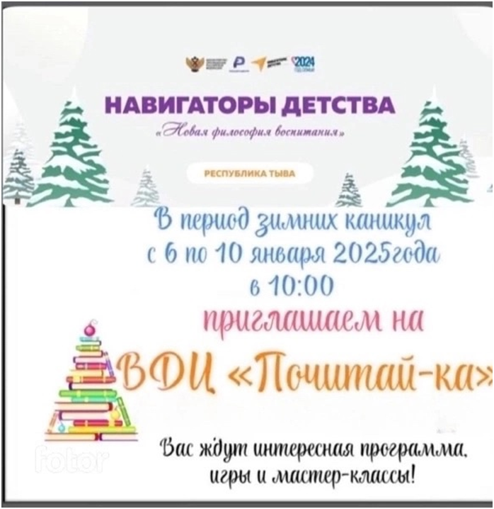 С 6 января стартовали мероприятия ВДЦ «Почитайка» на базе Центра детских инициатив школы под руководством советника директора по воспитанию Хертек С.И. и библиотекаря Хертек Ч.Ч. По плану 6 января проведены тренинг на знакомство, распределение актива, инструктажи по безопасности, оформление уголка ВДЦ «Новогодняя Почитай-ка», кинолекторий: просмотр новогодних фильмов, создание чата.