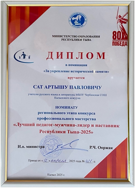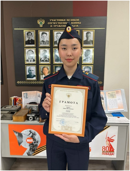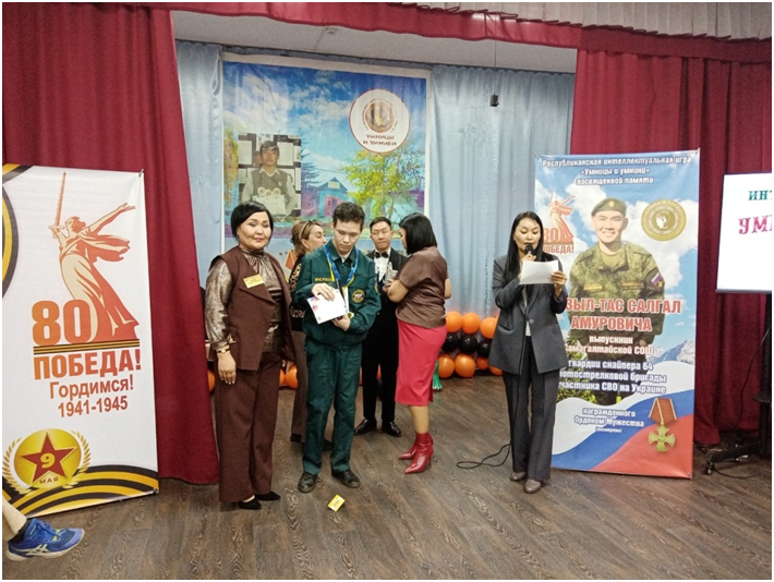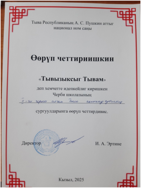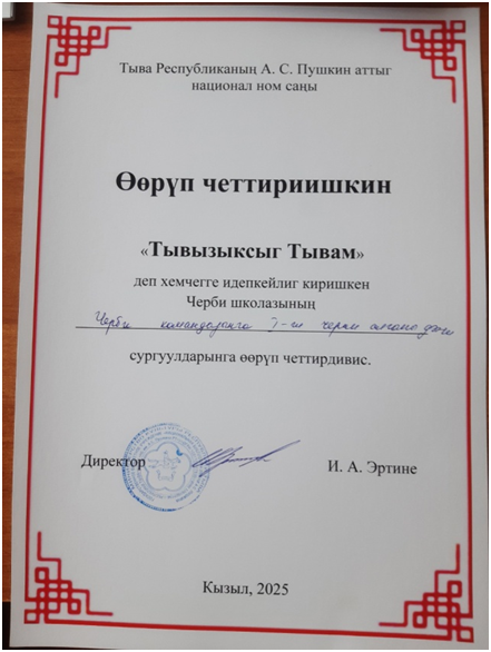 Прокуратурой Республики Тыва был организован литературный конкурс «Герои Великой Победы», посвящённый 80-й годовщине Победы в Великой Отечественной войне 1941-1945 гг. В конкурсе активное участие приняла ученица 10 класса Хертек Дарый. По результатам жюри она заняла 1 место в возрастной категории от 15 до 17 лет включительно. К участию в конкурсе принимались видеоролики, содержащие стихи, в том числе собственного сочинения, раскрывающие тему героических и трагических событий Великой Отечественной войны1941- 1945 годов.