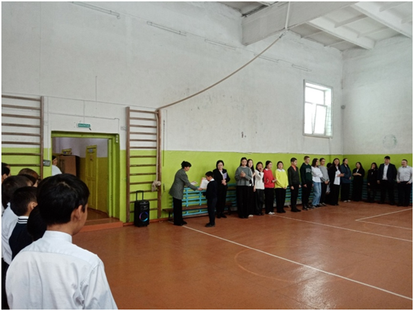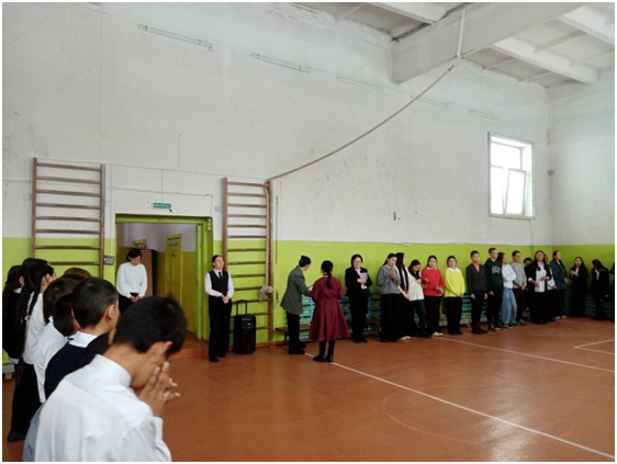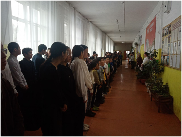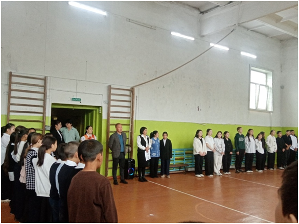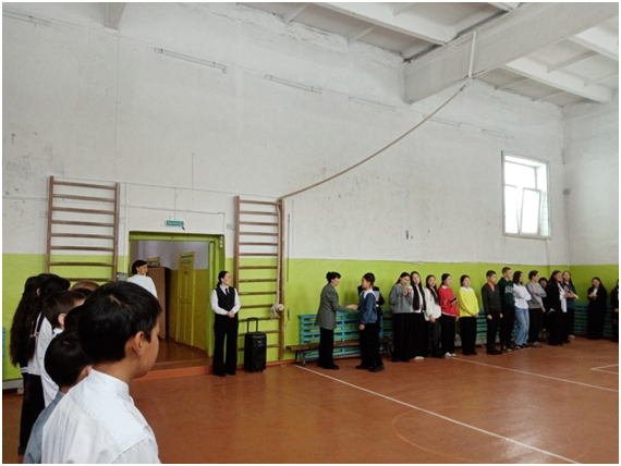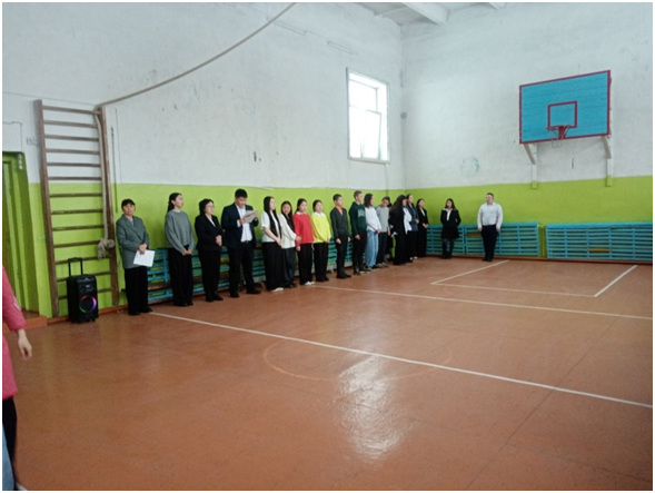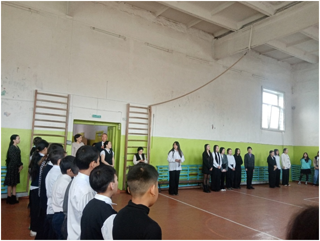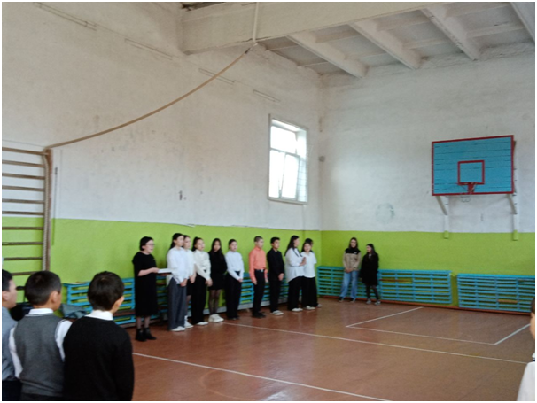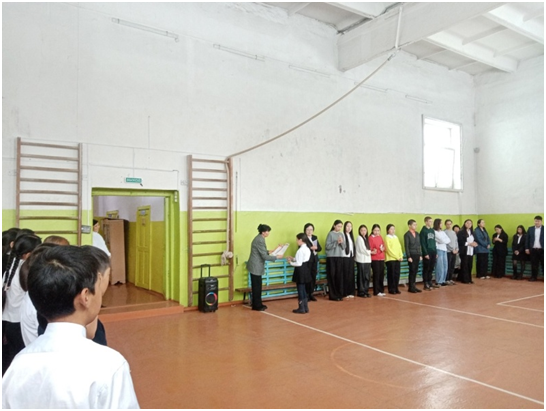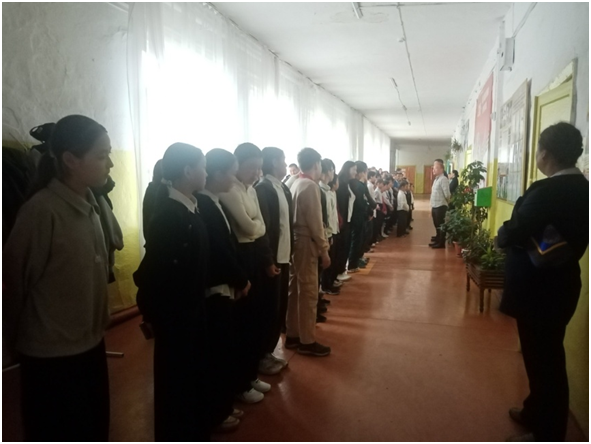 После церемонии поднятия государственных флагов проведена общешкольная линейка. На линейке подведены итоги прошедшей учебной недели, озвучены планы на текущую. Главное мероприятие – это конкурс — смотр строя и песни. Дежурство передано 7 классу (классный руководитель Сандый Ш.В.).