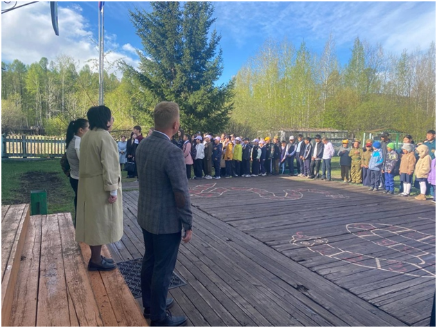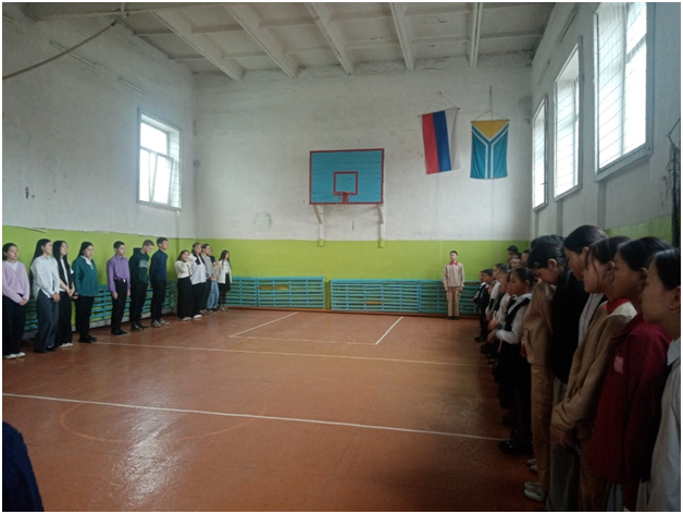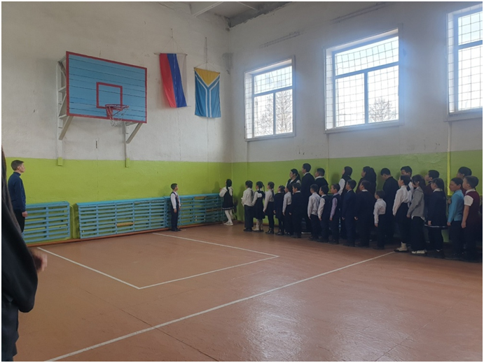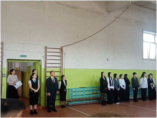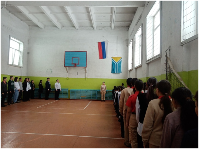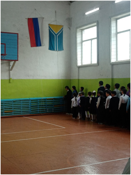 После церемонии поднятия государственных флагов проведена общешкольная линейка. На линейке подведены итоги прошедшей учебной недели, озвучены планы на текущую. Директор школы Доржу М.А. отметила, что учащимся предстоит пройти промежуточную аттестацию, выпускникам сдать экзамены на ГИА. Дежурство передано 6 классу (классный руководитель Ооржак Б.Б.).