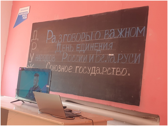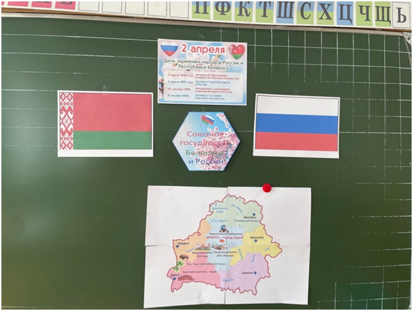 Затем классными руководителями во всех классах проведены внеурочные занятия из цикла «Разговоры о важном» на тему «.День единения народов России и Белоруси. Союзное государство» с целями формирования у обучающихся понимания значимости Союзного государства России и Юелоруси; осмысления перспектив интеграции и ее значения для будущего; формирования представлений о принципах партнерских отношений между странами; формирования интереса к его истории и культуре.