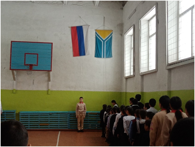 Учебный день новой недели начался с контроля по соблюдению мер безопасности по профилактике ОРВИ, гриппа и других инфекционных заболеваний. В 8.00 часов была организована церемония поднятия государственных флагов Российской Федерации и Республики Тыва. Право поднять государственные флаги предоставлено учащимся 4 класса Монгуш Уран-Сай и Хертеку Дензину, победителям Всероссийского конкурса «Леонардо» в г. Москва.