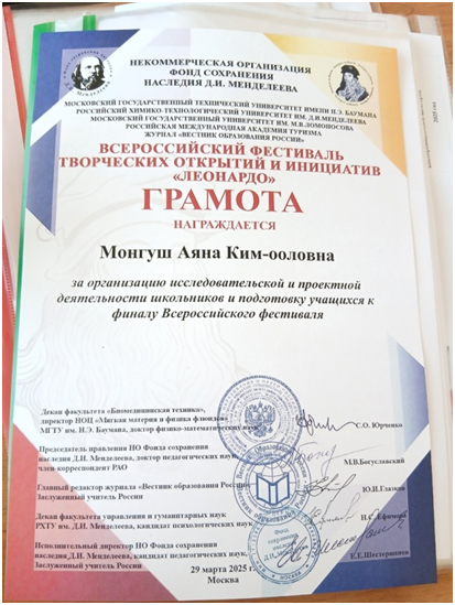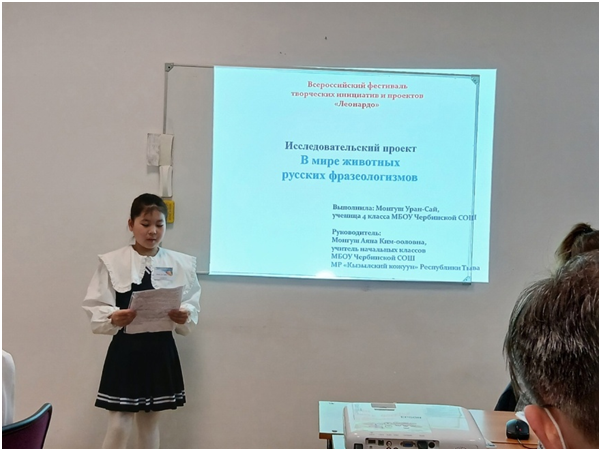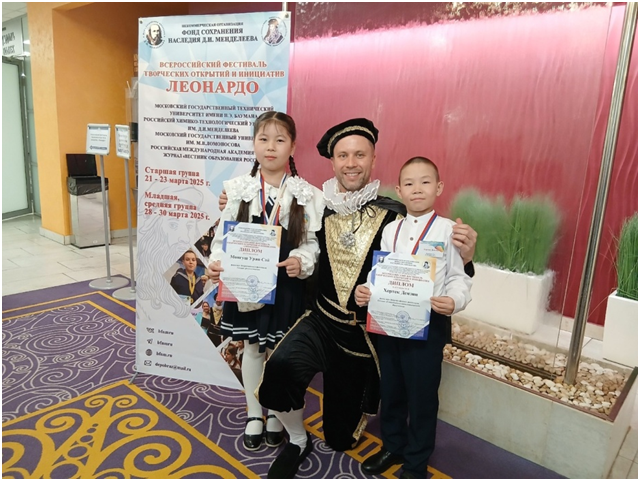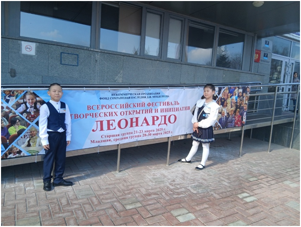 В дни весенних каникул в г. Москва завершился Всероссийский фестиваль творческих открытий и инициатив «Леонардо». Организатором мероприятия является некоммерческая организация «Благотворительный фонд наследия Менделеева». В этом году в фестивале приняли участие около 2000 школьников из 73 регионов Российской Федерации и Республики Таджикистан. В течение трех дней конкурсанты презентовали свои работы в 20 разнонаправленных секциях по 40 участников в каждой. Каждый из них вложил в свою работу старание, упорство и интерес. Из нашей школы в данном мероприятии участие приняли обучающиеся 4 класса Монгуш Уран- Сай и Хертек Дензин под руководством Монгуш Аяны Ким-ооловны, учителя начальных классов.. Они с успехом защитили свои работы и награждены дипломом финалиста, а также медалью «Шаги к успеху». Поздравляем руководителя и учащихся, желаем им дальнейших успехов!