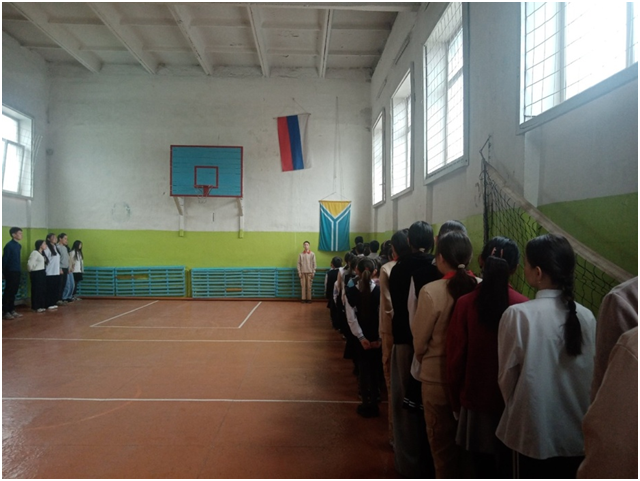 После церемонии поднятия государственных флагов проведена общешкольная линейка. На линейке подведены итоги прошедшей учебной недели, озвучены планы на текущую, о проведении Дня здоровья, Недели физики и информатики. Дежурство передано. Подведены итоги предыдущей учебной недели, поставлены задачи на следующую. Дежурство передано 9 «б» классу (классный руководитель Чооду М.Х.).