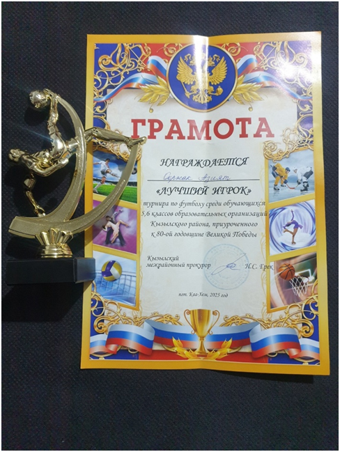 Сегодня также мальчики 5-7 классов под руководством учителя физической культуры Донгака О.Х. приняли участие в кожуунных соревнованиях по футболу, организованных Кызылской межрайонной прокуратурой. По итогам игры ученик 6 класса Ооржак Азият награжден как «Лучший игрок». Поздравляем Азията и руководителя!