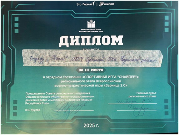 Сегодня состоялся региональный этап военно-патриотической игры «Зарница 2.0» для младшей возрастной группы. Данное мероприятие проходило на территории 55-я отдельной гвардейской мотострелковой бригады. Для участия прибыли самые лучшие, самые достойные – победители муниципальных этапов в своих районах. Право представлять Кызылский кожуун по результатам муниципального этапа игры была удостоена команда нашей школы. Всего приняли участие 16 команд республики. Наши юные патриоты достойно участвовали в игре и заняли 3 место в отрядном состязании «Спортивная игра «Снайпер». Они награждены дипломом. Поздравляем ребят и их наставников! Это важное событие в жизни школьников, которое воспитывает в них дух патриотизма, командный дух и готовность к преодолению трудностей. Эта игра — не просто соревнование, а настоящая школа мужества, где проявляют силу, ловкость, смекалку и умение работать в команде. «Зарница» учит уважению к истории, любви к Родине и готовности защищать её интересы.