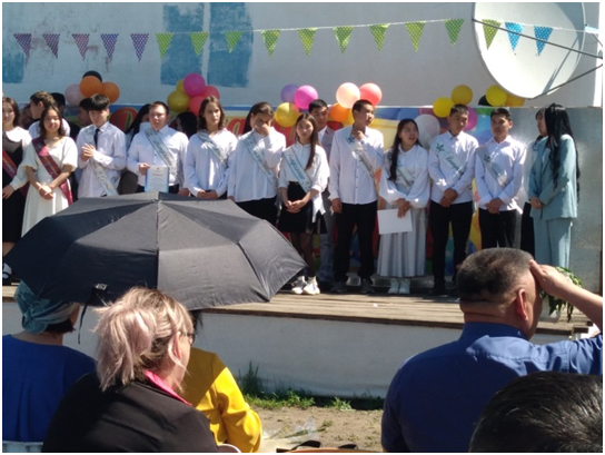 На торжественную линейку были приглашены выпускники 4, 9-х и 11 классов. Мероприятие открыли ведущие Монгуш Аюржана и Ооржак Айдыс, учащиеся 6 и 7 классов. Выпускники 4, 9-х и 11 классов присутствовали со своими классными руководителями: Монгуш А.К., Соян А.А., Чооду М.Х.
